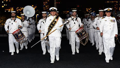 Place the pointer over the navy band to see John's last ship, HMAS Vampire. Then place the pointer over John and Paul marching to hear the band.